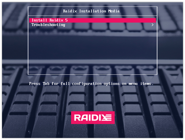 После загрузки с установочного носителя, в открывшемся окне выберите Install RAIDIX 5.2.4 и нажмите Enter.