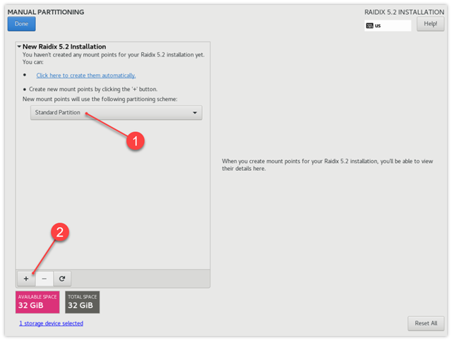 Чтобы создать основные разделы, на странице MANUAL PARTITIONING:
