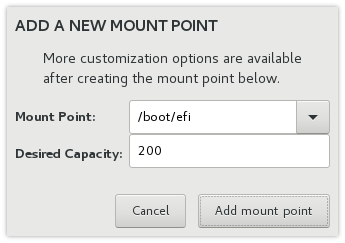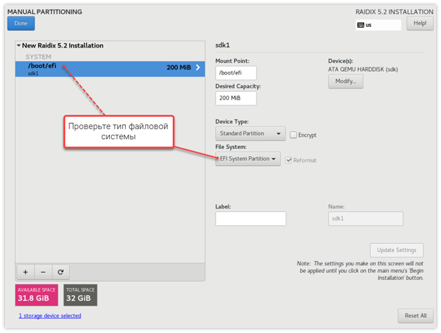 и в открывшемся окне укажите следующие параметры загрузочного раздела:- Mount Point: /boot/efi