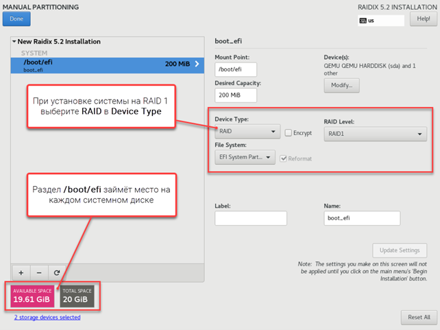 Рис. 13. Настройка EFI-раздела при установке системы на RAID 1
