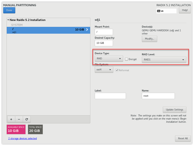 Если вы устанавливаете систему на RAID 1, в Device Type раздела выберите RAID.