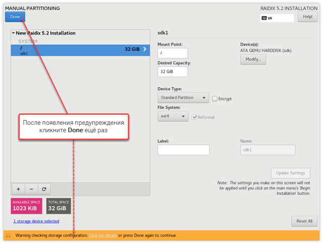 Кликните Done. При появлении предупреждения (warning) подтвердите созданную конфигурацию повторным кликом Done.