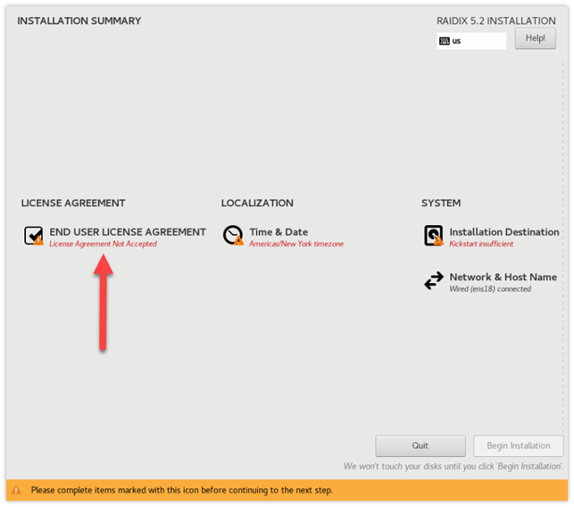 Рис. 2. Главная страница INSTALLATION SUMMARY: выбор настройки Лицензионного соглашения (License Agreement)