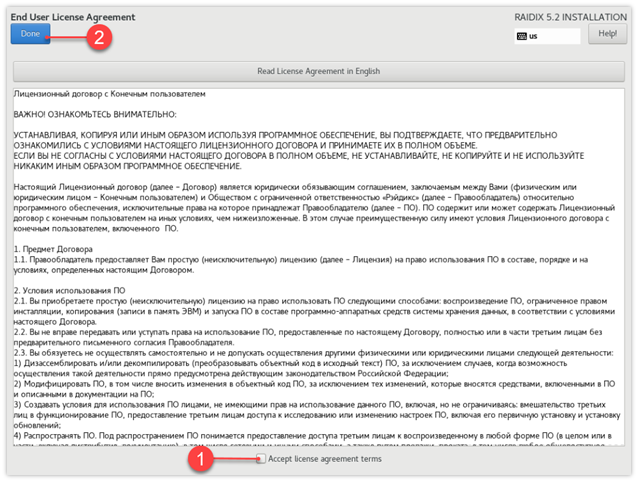 По завершении чтения примите условия лицензионного сообщения, кликнув Accept license agreement terms, затем кликните Done.