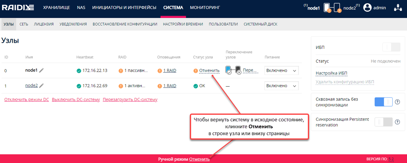 Для возвращения RAID на узлы согласно «предпочтениям», кликните Отменить на любой странице GUI любого узла. Для этого необходимо, чтобы оба узла системы были в рабочем состоянии.
