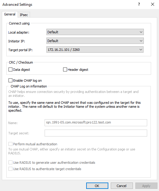 Рис. 5. Окно Advanced Settings : Для улучшения производительности рекомендуем создавать 3 сессии для каждого соединения.Чтобы проверить сессии, в окне iSCSI Initiator Properties во вкладке Targets кликните Properties.
