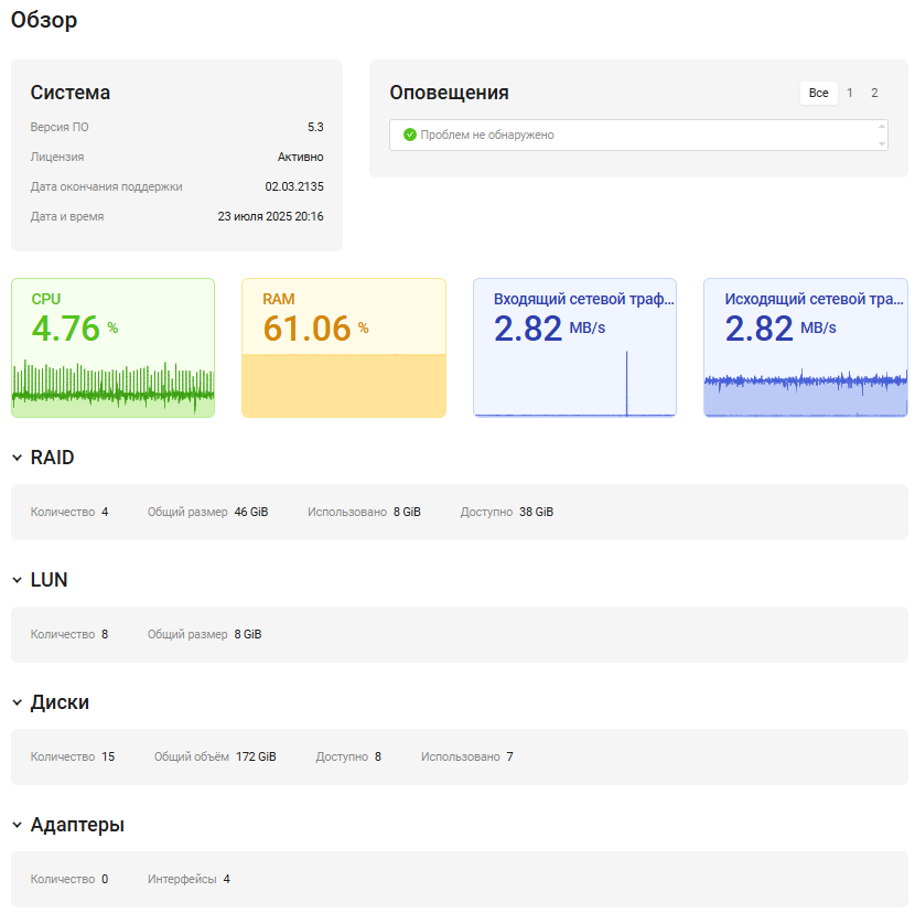 Все актуальные события с объектами СХД. В DC-системе доступны оповещения с обоих контроллеров. Подробнее о системных событиях в главе Оповещения.