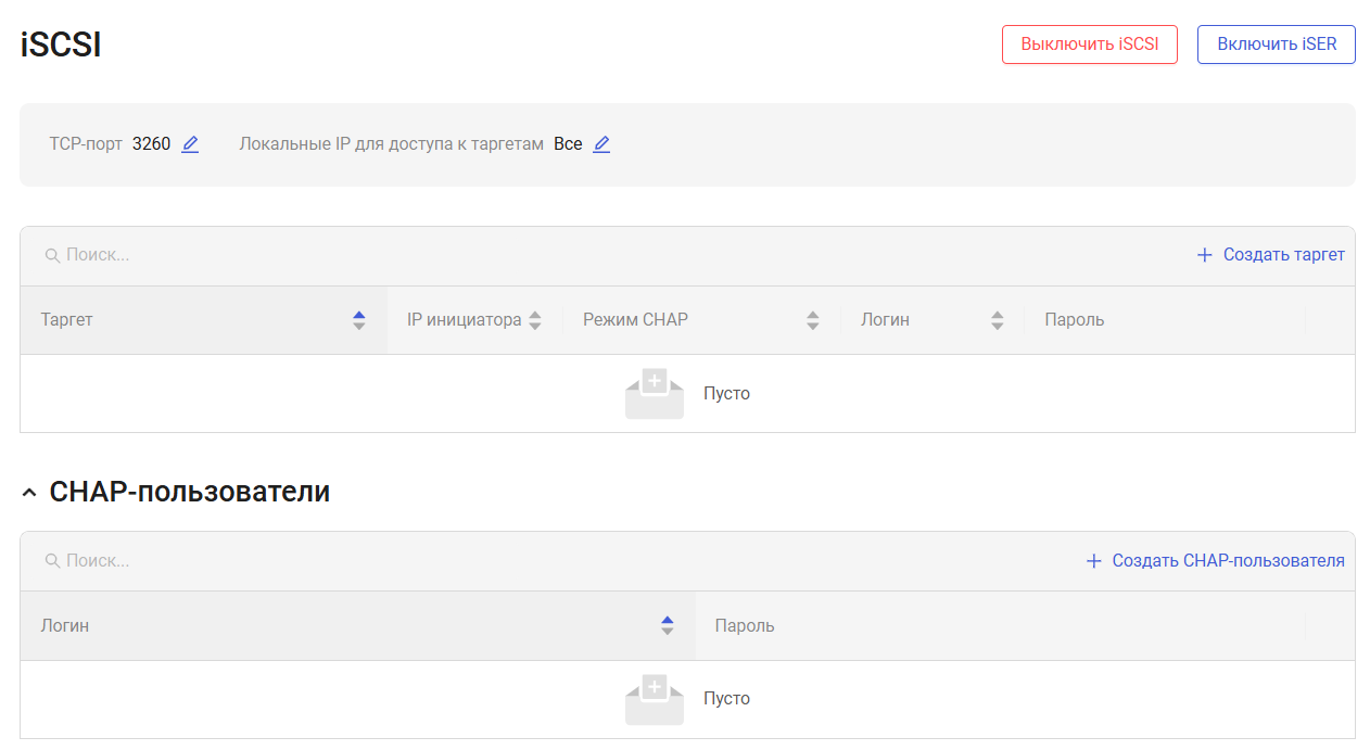Для настройки блочного доступа и/или канала синхронизации данных по протоколу iSER включите сервис iSCSI, затем сервис iSER.
