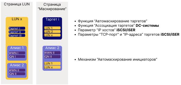 При маскировании инициаторов для LUN назначаются инициаторы (через алиас инициаторов), которые будут иметь доступ к LUN, и тип доступа этих инициаторов.