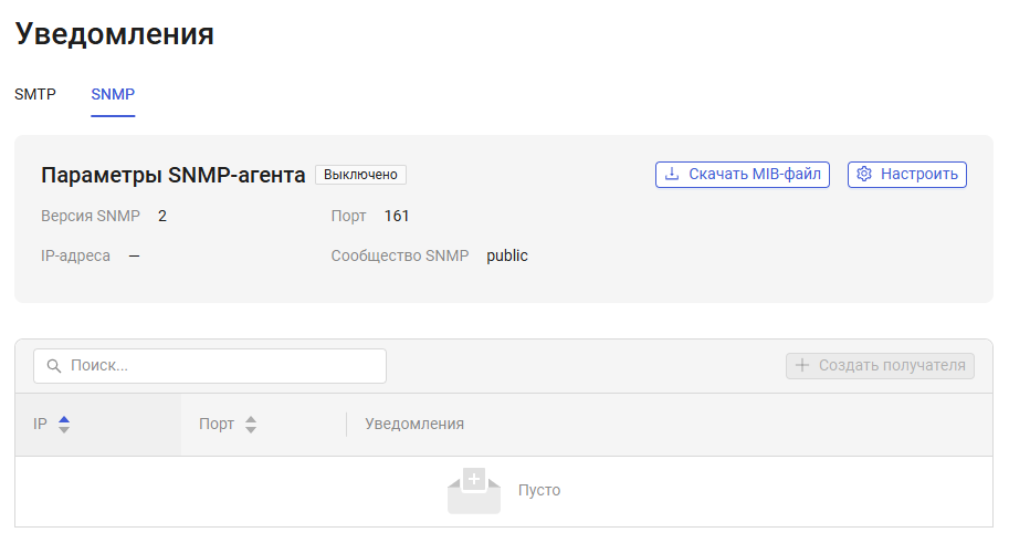 Управление получателями доступно во вкладке SNMP.