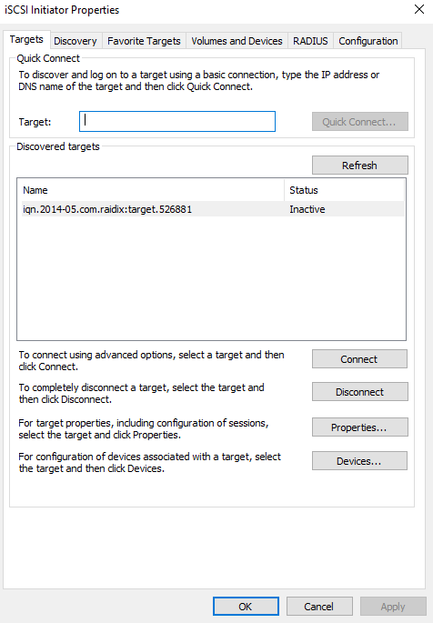 Во вкладке Targets в поле Discovered targets кликните на обнаруженный iSCSI-таргет и кликните Connect.