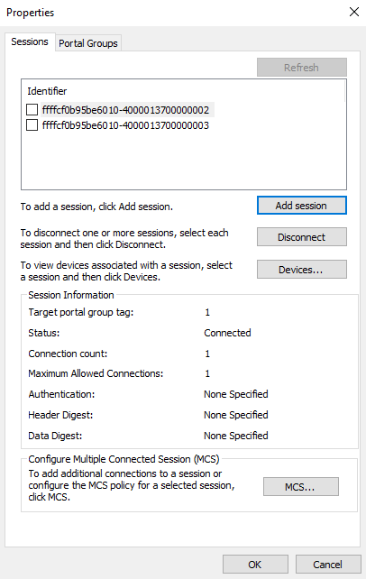 : Для улучшения производительности рекомендуем создавать 3 сессии для каждого соединения.Чтобы проверить сессии, в окне iSCSI Initiator Properties во вкладке Targets кликните Properties.