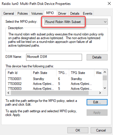Рис. 8. Определение политики MPIO. Выбрано значение Round Robin With Subset