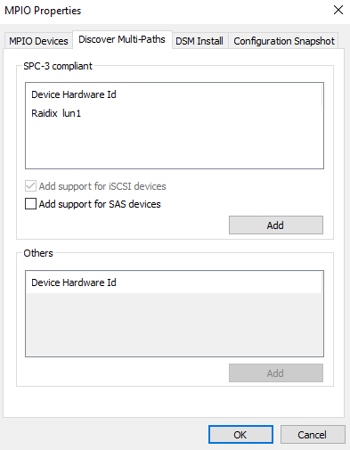 Откройте вкладку Discover Multi-Paths. Включите Add Support for iSCSI Devices и кликните Add.