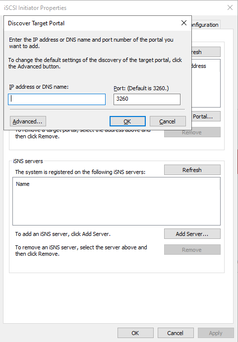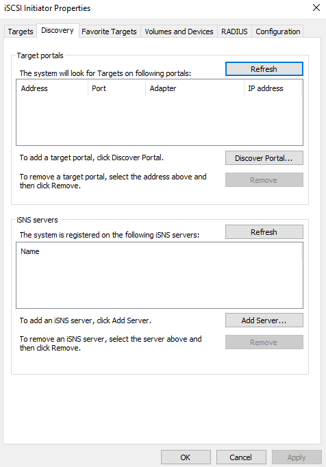 В открывшемся окне iSCSI Initiator перейдите во вкладку Discovery. Кликните Discover Portal.